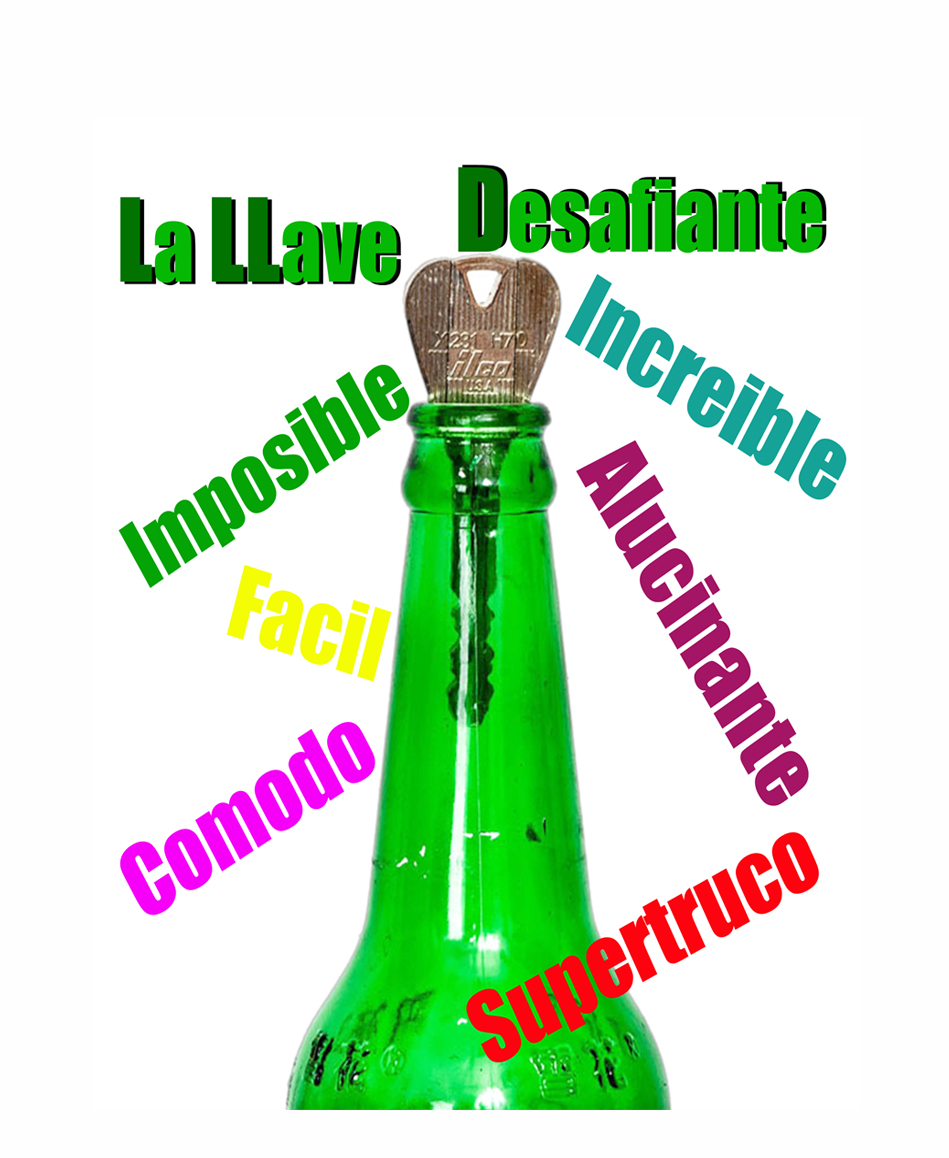 Llave que atraviesa botellas, anillos, etc. El Mago presenta una llave y una botella, entrega las dos al espectador para que compruebe que son totalmente normales y que es imposible que la llave atraviese la boca de la botella pues es más pequeña que la llave. El mago introduce la llave en la boca de la botella, realiza unos pases mágicos y de un golpe la introduce dentro de la botella.
